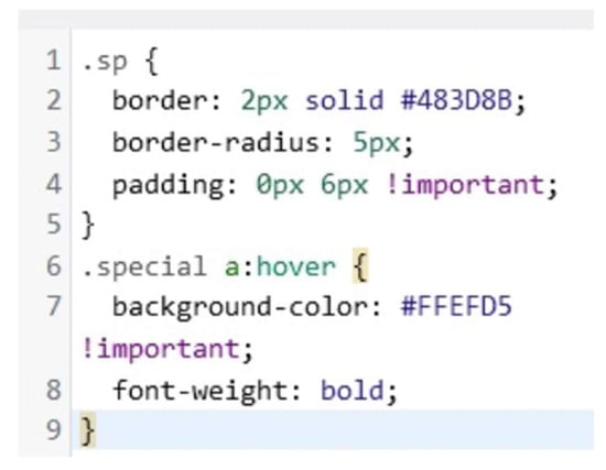 Important parts of the construction and implementation of the model are the customizations of the selected WordPress theme and the added plugins. The theme allows customization of page templates and widgets, custom styles when editing a post, and sidebar management. Sidebar widget customization to display recent posts in the ecosystem is performed through the standard WordPress capabilities, through the additional settings embedded in the theme, or through an additional CSS class for the selected block (Figure 8).