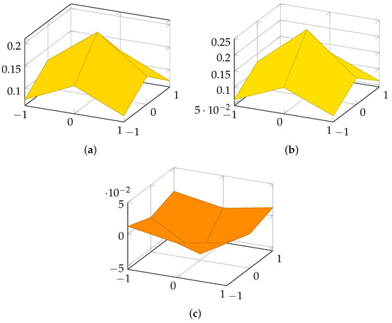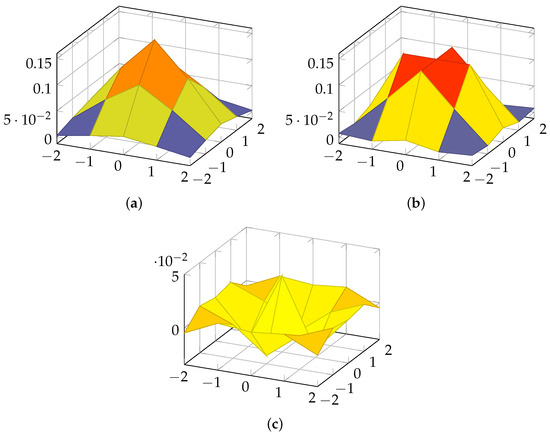 Three-dimensional plots for the (a) exact Gaussian kernel, (b) proposed approximate Gaussian kernel, and (c) the error for and .