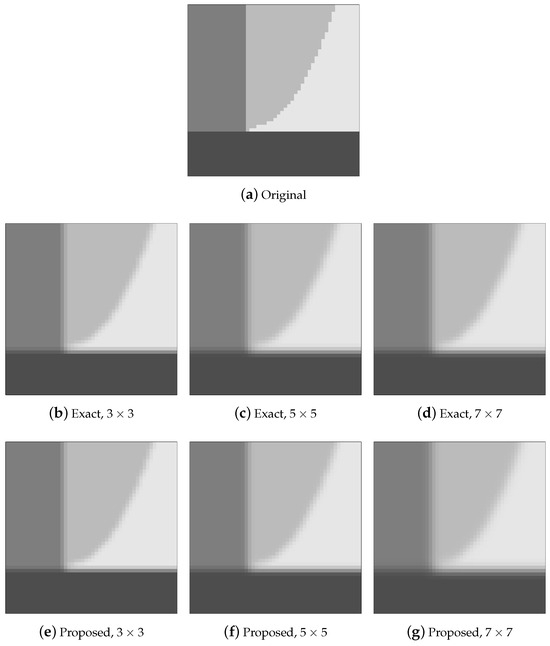Because we aim at the implementation of low-complexity 2D Gaussian filters, we used the minimal wordlength to represent the Gaussian filter coefficients, according to the number representations outlined by Garg–Sharma [30] and by Khorbotly–Hassan [29], corresponding to 6-, 8-, and 15-bit representations for the , , and , respectively (using the Khorbotly–Hassan [29] notation, we used , , and , for masks sizes , , and , respectively).