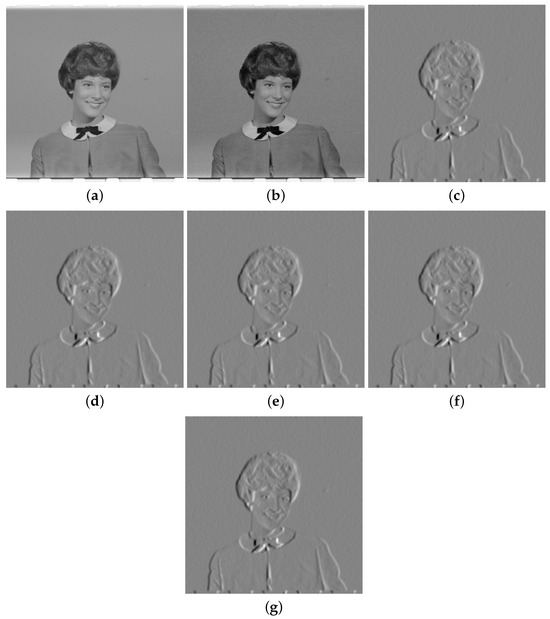 Two-dimensional Gaussian filtering as a preprocessing step for Sobel edge detection. (a) Original and (b) noisy images. Output filtered images according to kernels: (c) exact, (d) Khorbotly–Hassan [29], (e) Garg–Sharma [30], (f) Cabello et al. [31], and (g) proposed.