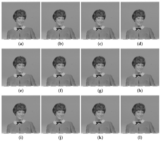 Image filtering using the implemented hardware for , , and filters according to the proposed method and the competing methods by Khorbotly–Hassan [29], Garg–Sharma [30], and Cabello et al. [31]. (a) Proposed, . (b) Ref. [29], . (c) Ref. [30], . (d) Ref. [31], . (e) Proposed, . (f) Ref. [29], . (g) Ref. [30], . (h) Ref. [31], . (i) Proposed, . (j) Ref. [29], . (k) Ref. [30], . (l) Ref. [31], .
