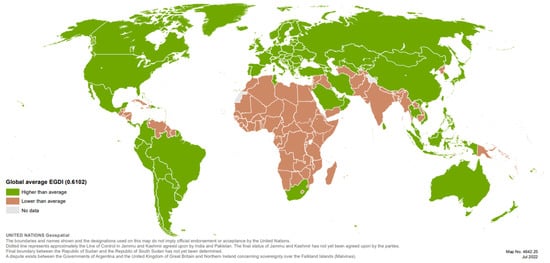 Geographical distribution of countries with EGDI values above and below the global average EGDI value; United Nations [21].