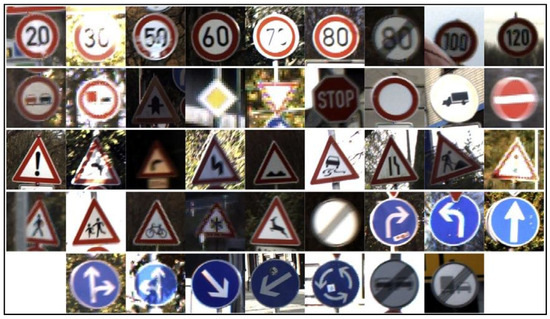 - Stallkamp, J.; Schlipsing, M.; Salmen, J.; Igel, C. The German Traffic Sign Recognition Benchmark: A multi-class classification competition. In Proceedings of the IEEE International Joint Conference on Neural Networks (IJCNN), San Jose, CA, USA, 31 July–5 August 2011; pp. 1453–1460. [Google Scholar]