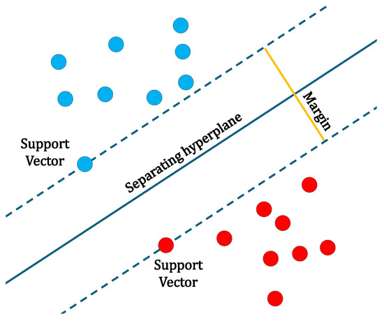 The diagram in Figure 2 depicts the fundamental components of a Support Vector Machine (SVM) classifier. The separating hyperplane (blue line) serves as the decision boundary that divides the two class, represented by red and blue dots. The support vectors (circled lines) are the critical data points that lie closest to the hyperplane and are used to define the margin. The margin (orange line) is the distance between the dashed lines parallel to the hyperplane, which pass through the support vectors. Maximizing this margin enhances the model’s ability to generalize to unseen data.