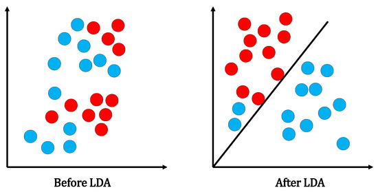 Linear Discriminant Analysis (LDA) process showing data distribution before (left) and after (right) LDA. Post-LDA, data is projected to maximize class separation, enhancing classification by preserving discriminatory information.