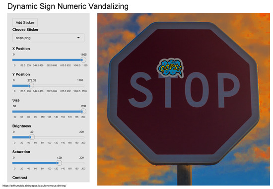 To visually showcase the diverse modifications we can apply to our database, we developed an interactive dashboard showcased on Figure 7. This platform allows users to observe and interact in real time with the changes implemented in the database. By visiting the dashboard on this link (https://arthurrubio.shinyapps.io/autonomous-driving/) (accessed: 1 October 2024), users can gain a hands-on understanding of how data alterations can influence outcomes in real-time.