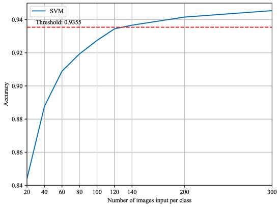 SVM accuracy performance as a function of the number of input images per class (blue). Threshold set at 99% of the final achieved accuracy (red).