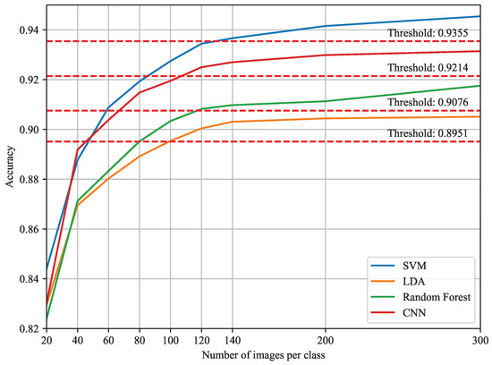 Firstly, let us examine the performance of the SVM model. As illustrated in Figure 10, we can observe that the best performance is reached for approximately 120 images per class as input. Beyond this point, the model’s performance no longer significantly improves. Additionally, we can see that the convergence towards this performance is relatively rapid. For a low number of images per class, an increase of 20 images can lead to an increase of up to 3% in accuracy.