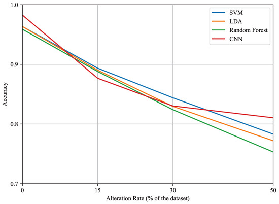 When comparing classical Machine Learning models with Deep Learning models, we consistently observed similar behaviors. Both model types struggle to regain performance after dataset alteration, but the way accuracy declines with increasing alteration differs. Deep Learning models, despite their advanced architecture, exhibit a faster drop in performance at lower alteration levels, which might make them less suited for real-world scenarios where such alterations are common. As such, Deep Learning models may not always be the optimal choice depending on the problem’s context. From a resource-saving perspective, traditional models can provide acceptable performance while being less computationally demanding, making them valuable in scenarios with hardware constraints.