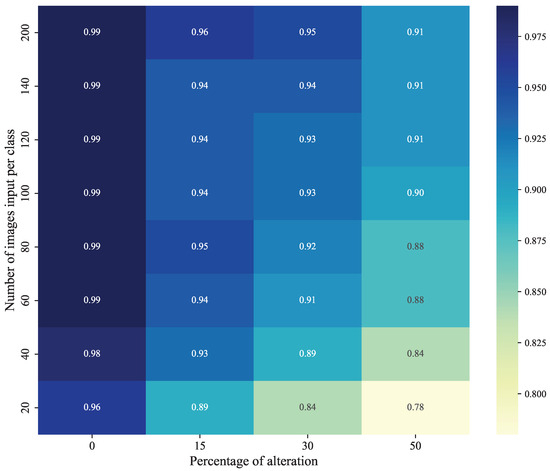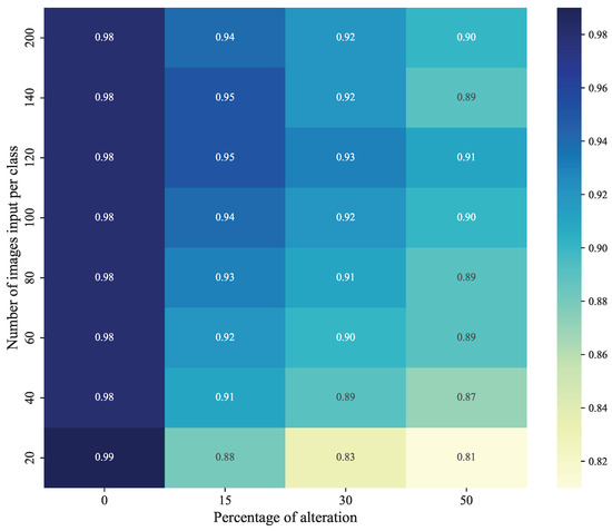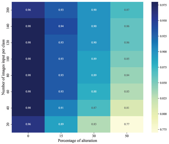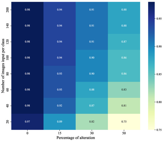 In the SVM model heatmap shown in Figure 13, several observations can be made. Firstly, for an unaltered dataset, the accuracy threshold is reached with 40 input images. For other levels of alteration, the thresholds are at about 80, 100, and 120 images per class. Therefore, for SVM models, the introduction of alteration significantly increases the number of images required to reach the accuracy threshold. However, this observation holds true primarily for the transition from a clean dataset to an altered one. When transitioning from an altered dataset to one with even more alterations, the additional number of images required to reach the threshold decreases sharply, from 20 images to 60 images.