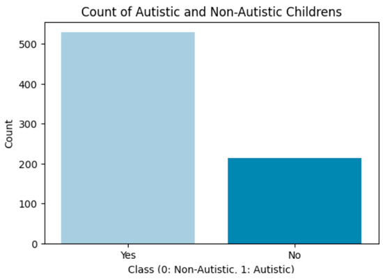 After data preprocessing, which involved removing null and missing values, the final dataset consisted of 742 instances, which were used for the experiments. This dataset was collected from various rehabilitation centers across Pakistan and included data from children aged 1 to 4 years, covering both male and female participants. Specifically, the dataset comprised 434 male children and 308 female children. However, it is important to note that the dataset was imbalanced, with 528 instances labeled as ‘Yes’ (indicating autism traits) and 214 as ‘No’ (indicating no autism traits), as shown in Figure 2. To handle this imbalance, we applied appropriate evaluation metrics such as precision, recall, F1-scoring, and ROC-AUC scoring, which are more suitable than simple accuracy for imbalanced datasets. These metrics allowed us to properly assess the classification performance, particularly in identifying children with autism traits, which is crucial for the early detection of and intervention in autism spectrum disorder (ASD).