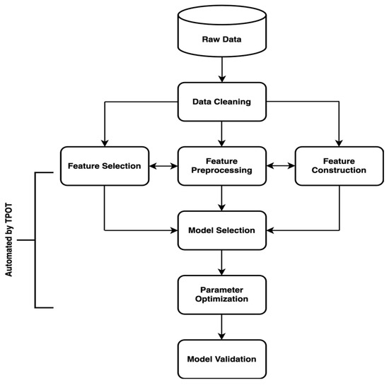 TPOT is a library for automating the procedure for selecting the best ML model and hyperparameters, saving time and improving the results. Instead of manually testing alternative models and configurations for data, TPOT uses genetic programming to explore a variety of ML pipelines and select the one that is most suited to an individual dataset [26,27]. TPOT represents a pipeline model using a binary decision tree structure. This covers data preparation, algorithm modeling, hyperparameter tuning, model selection, and feature selection, as shown in Figure 3.