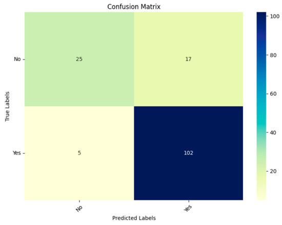 The confusion matrix of the best model generated by TPOT, which is the Random Forest classifier, is shown in Figure 6. It demonstrates that of the 30 actual “No” instances, 25 were accurately predicted as “No” (true negatives), while 5 were incorrectly predicted as “Yes” (false positives). Of the 119 actual “Yes” instances, 102 were true positives (TPs), whereas 17 were false negatives (FNs). Overall, the confusion matrix illustrates that the classifier performs well in identifying the positive class.