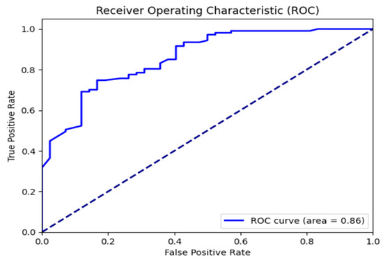 The Receiver Operating Characteristic (ROC) curve of the model, which compares the True Positive Rate (TPR) to the False Positive Rate (FPR), is shown in Figure 7. It was used to assess the Random Forest classifier’s performance. With an Area Under the Curve (AUC) of 0.86 on the generated ROC curve, the model is very capable of differentiating between the positive and negative classes.
