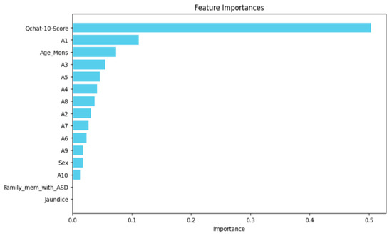 The analysis revealed that the “Q-CHAT 10 score” was the most influential feature, consistent with the findings from the TPOT, which also identifies this attribute as an important key feature. Figure 14 illustrates the workflow and highlight the importance of various features.