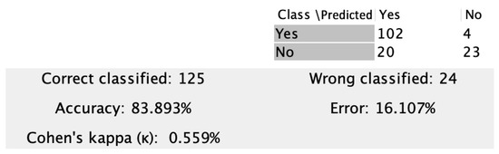 It achieved an impressive accuracy of 83.89% on the test set. Finally, the Scorer node was employed to assess the accuracy of the model, providing a detailed performance evaluation and confirming the reliability of the results. The confusion matrix can be seen in Figure 11.