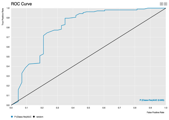 In Figure 12, the ROC curve created by KNIME provides a visual picture of the model’s ability to distinguish between autistic and non-autistic classes. The ROC curve in Figure 4, Figure 5, Figure 6, Figure 7 and Figure 8 shows the classification model’s performance by displaying the True-Positive Rate (sensitivity) vs the False-Positive Rate (1-specificity) at various threshold values. The value 0.8 shown in the figure represents a specific threshold used to identify expected probabilities as positive or negative at that point on the curve. It is vital to understand that 0.8 is a classification threshold, and is also the Area Under the ROC Curve (AUC).