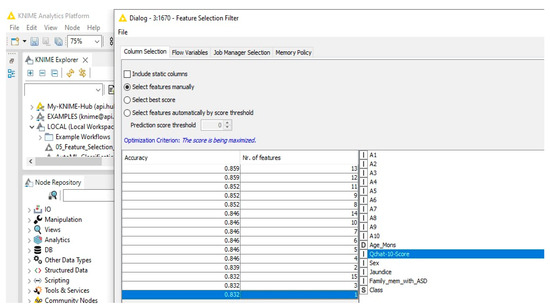 Finally, this work highlights the use of AutoML in the field of ASD identification. In this study, TPOT demonstrated superior performance, achieving 85.23% accuracy for the Random Forest classifier model in ASD diagnosis as compared to 83.89% accuracy with KNIME. A crucial part of this research was a comparative analysis of feature selection methods, which revealed the critical importance of the “Q-CHAT 10 score” across both the TPOT and KNIME workflows. This demonstrates the importance of automated feature selection in improving the accuracy of ASD diagnostic models. By rigorously evaluating feature relevance, this study identified the main factors required for ASD diagnosis, allowing for a better understanding of the disorder’s diagnostic indicators. The findings emphasize the importance of using AutoML methods for the feature selection process and of accelerating the model-building process. Through this focus on feature selection, this research contributes to the progress of ASD diagnosis and underscores the transformative potential of AutoML in clinical practice.