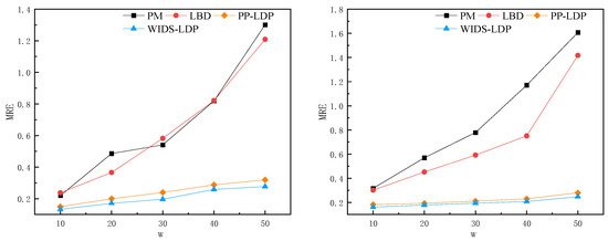 As shown in Figure 4, the impact of different privacy budgets on MRE is illustrated. Four different schemes were tested on various datasets with a sliding window length of 20 and data length of . As the privacy budget increases, the MRE decreases. This is because a higher privacy budget per window allows for a larger allocation of the budget to each sampling point, reducing the error, provided other conditions remain unchanged. Thus, the privacy budget is inversely proportional to the MRE.