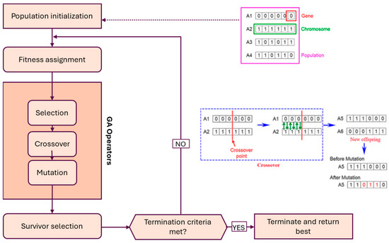 The next operator involved in the generation process is mutation. The function of this operator is that bits of a string are selected randomly and with a small probability, and the value in them is copied. This means that if the desired bit value is zero, it changes to one, and vice versa. In fact, this action creates variety and searches for more design space. Finally, a new generation of designs will be created, and this new generation must have a better fit than the previous generation. This process continues until the criteria for stopping the algorithm are met, such as reaching an acceptable level of answers, passing a certain predetermined time, passing a certain number of repetitions (generations), or passing a certain number of repetitions in case there is no specific improvement [16,17]. Figure 2 shows the flow chart of a GA [9].