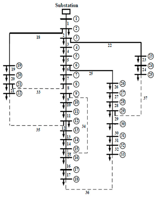 The network under study includes 33 main buses as seen in Figure 5. Bus number 1 is connected to the main network, and the required power of the loads is obtained through this bus from the main network. The permissible range of voltage change of the generators is assumed to be between 0.95 and 1.05 per unit. Also, the active and reactive loads of the whole network are 3.715 MW and 1.8 MVAR, respectively. The operating voltage of this network is 12.66 kV. The 33-bus network includes resistance, reactance, line susceptance, and the amount of permissible power passing through the lines. The base load values are the values presented in [21]. Further information is provided in Appendix A.