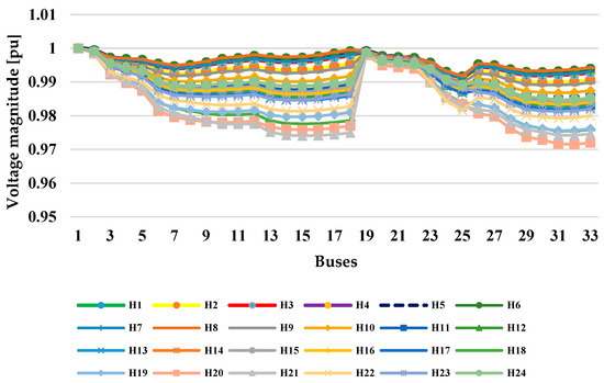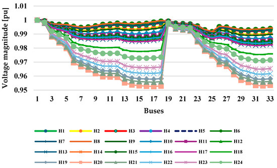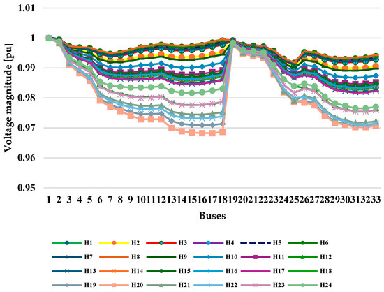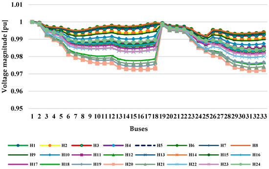 - Initial state: The state of the network without performing any management (implementation of the load response program) is investigated, as seen in Figure 6. This initial state is considered as the zero scenario. As observed, in this case, the voltage profile is between 0.95 to 1 per unit. Now, for example, the voltage magnitude of bus number 18 at H20 (8:00 p.m.) is 0.95294 per unit, which should be improved after optimization algorithms.