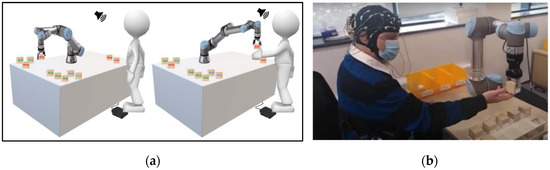 (a) Cobot–Stroop Task [] (b) A demonstration of coworking with a cobot while doing cobot Stroop task [].