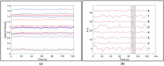 (a) Raw fNIRS data (red and blue showing two light intensities); (b) fNIRS data after artifact removal and preprocessing [].