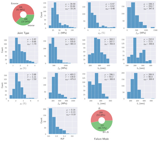 The dataset that was employed in the present study consists of 486 experimental measurements on reinforced concrete beam–column joints. These were drawn from a large selection of 153 previously published studies, originally compiled in [19]. In all experiments, the specimens underwent cyclic loading until failure to simulate their behavior and collapse during a major earthquake. The failure mode of each specimen was recorded, as well as the measured stress at which failure occurred.