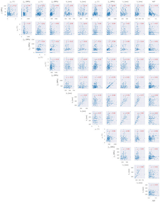 Among the above independent variables, 12 are numeric and describe several geometric and mechanical aspects of the structural elements (joint, beams, and columns), such as their dimensions or their percentage of reinforcement. The last independent variable is categorical and describes the type of the joint, i.e., whether it is interior or exterior. Figure 1 shows the distributions of the target variable and features of the dataset, and Table 1 presents a short description of each one [19]. In addition, Figure 2 provides a pairplot of the independent variables in the dataset. For each pair of variables, each subplot of Figure 2 includes the well-known Pearson’s correlation coefficient . For a pair of variables , this is defined as [25]