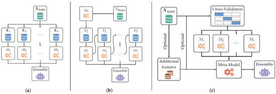 Illustration of ensemble methodologies. (a) Bagging, (b) boosting, and (c) stacking [43]. In the above, , are the transformed training datasets examined in the previous paragraphs.