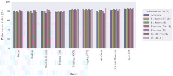 On the contrary, AdaBoost, stacking, voting, and the bagging ensemble of k-NNs exhibited a higher variability in their respective performance metrics. On the one hand, AdaBoost obtained a very high Recall for the class “Joint Shear” (“JS”) with a corresponding high Precision for “Beam Yield-Joint Shear” (“BY-JS”). Conversely, its Precision on “JS” and Recall on “BY-JS” were lower. This indicates that this ensemble classifier favored “JS”, as it tried to identify all the correct instances of this class, even at the expense of “BY-JS”. On the other hand, stacking, voting, and the bagging ensemble of k-NNs were more biased towards “BY-JS”. They obtained a high Recall for this class and a corresponding high Precision for “JS”.