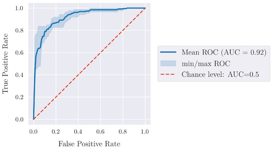 Finally, Figure 5 presents the so-called Receiver Operating Characteristic (ROC) [46] curve for the best-performing classifier, XGBoost. The corresponding Area Under the Curve (AUC) is a measure of the overall performance of the model. It can be readily observed that the model can achieve very high True Positive Rates, i.e., correct predictions, without producing a correspondingly high False Positive Rate. Furthermore, the ROC curves do not exhibit a large variability throughout the cross-validation process.