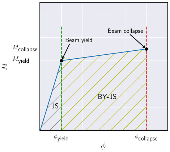 To illustrate the above, we present in Figure 6 an indicative moment–rotation () curve for an idealized elastic–plastic beam with hardening. The area under the curve corresponds to the amount of seismic energy that the structural system absorbs. If the joint fails prior to the yielding of the beam, this corresponds to the JS failure mode. Accordingly, if the beam yields prior to the failure of the joint, this corresponds to the BY-JS failure mode. Thus, it can be seen that in the latter case (BY-JS failure mode), the structural system is capable of absorbing larger amounts of seismic energy, which leads to improved performance. On the other hand, if the joint is the first to fail, no further amounts of energy can be absorbed, and the structural system suffers a sudden loss of stability due to brittle shear fracture, contrary to hardening, which does not occur instantaneously.