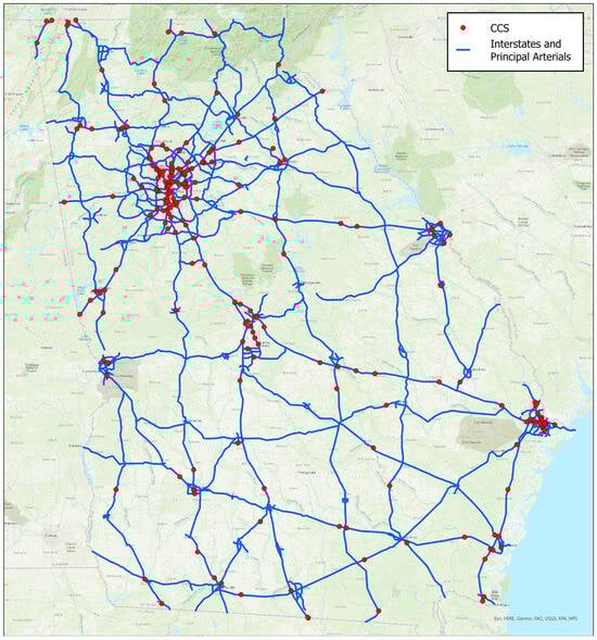In this paper, we used 2015 Georgia’s statewide highway network, which consists of 43,370 segments with 326 Continuous Count Stations (CCSs). For the purpose of this study, traffic sensors were referred to as CCS. To demonstrate our approach, we focused on the major highway network (functional class 1, 2 and 3) which includes interstates, freeways and expressways and principal arterials, resulting in 15,318 road segments with 246 CCS, depicted as red dots in Figure 1.
