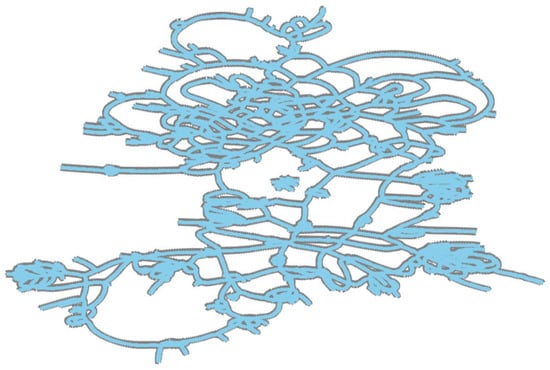 In this study, the target area was determined by applying a percentile threshold () to the kriging variance, focusing on regions with higher variance []. It is important to select an appropriate threshold value to balance the confidence of finding optimal solutions with the computational load. For demonstration purposes, we set , i.e., reducing the search space by half. The resulting target area, where the kriging variance exceeds the 50th percentile, is visually depicted in Figure 7. Figure 8 further illustrates the corresponding highway network within this high-variance region.