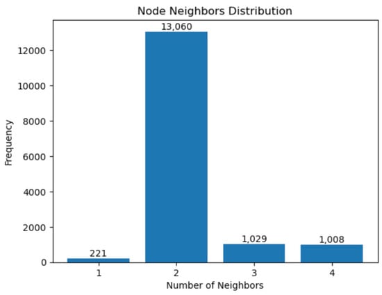 The distribution of direct neighbors is shown in Figure 3, revealing that the majority of the nodes have two neighbors, followed by the segments with three and four neighbors regarded as intersections, while only a few segments with one neighbor indicated the ends of road segments.