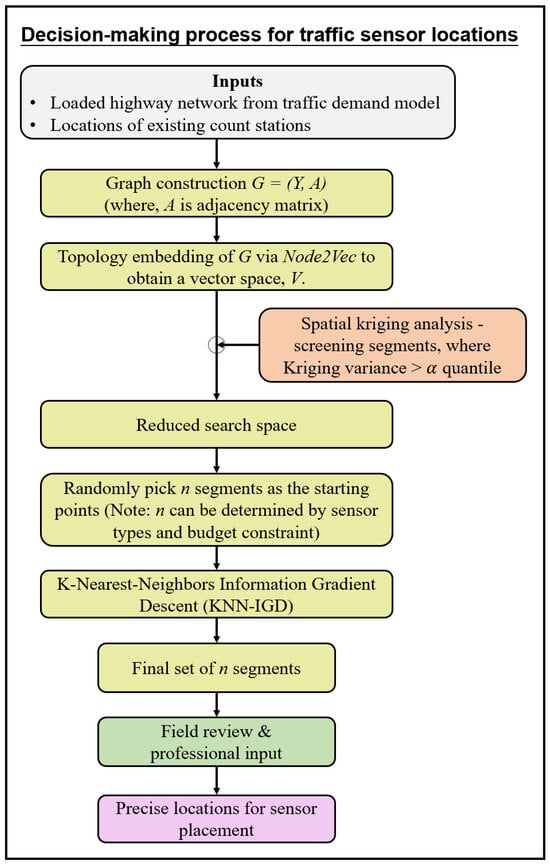 In this paper, we present a flexible framework for addressing the traffic sensor location problem by leveraging graph representation and information theory. The framework involves representing a target highway network as a directed graph, followed by embedding the graph into a vector space. Our search method, KNN-IGD, navigates this embedding space by following information gradients relative to K nearest neighbors and occasionally exploring beyond the neighbor set when no further information gain is detected. To expedite the search process, we leverage spatial correlations among existing sensors and apply spatial kriging analysis to identify target zones with high kriging variance. While this study focuses on continuous count stations, typically equipped with inductive loops embedded in the pavement, some researchers have suggested the use of Automated Vehicle Monitoring (AVM) and FCD [] for Origin-Destination flow estimation. Incorporating FCD and other probe sensor data alongside spatial kriging analysis of sensor data can improve traffic volume estimation. By leveraging both kriging and KNN-IGD methods, this integration has the potential to enhance the accuracy of traffic flow predictions, particularly in areas with limited sensor coverage. However, due to the sampling nature of these data sources, they do not provide reliable traffic volumes directly. Nevertheless, such data could complement spatial kriging analysis by identifying areas with higher uncertainty in traffic flow. By integrating diverse data sources, fixed-location sensors can serve as ground truth for correlating with mobile sensor data, offering an alternative way to estimate traffic volumes in areas lacking count stations. This approach could significantly reduce the costs associated with operating and maintaining statewide fixed-location sensor networks.