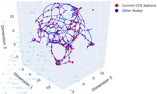 Specifically, we set p = q = 1 as our goal to encode the network topology while preserving its structural integrity without introducing bias toward either the local or global structure of the network. To visualize the embeddings generated by Node2Vec, we used Uniform Manifold Approximation and Projection (UMAP). UMAP has proven highly effective in providing a competitive low-dimensional manifold representation while preserving more of the global structure in the embeddings []. As shown in Figure 5, UMAP strikes a balance between local and global connectivity. The current CCS locations are represented by red dots, reflecting a representative sampling of network segments within the embedding space.
