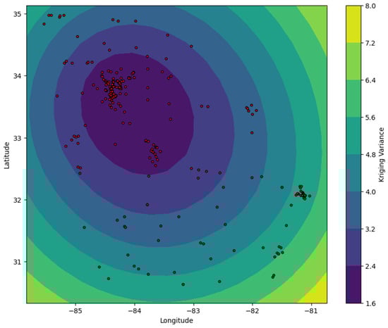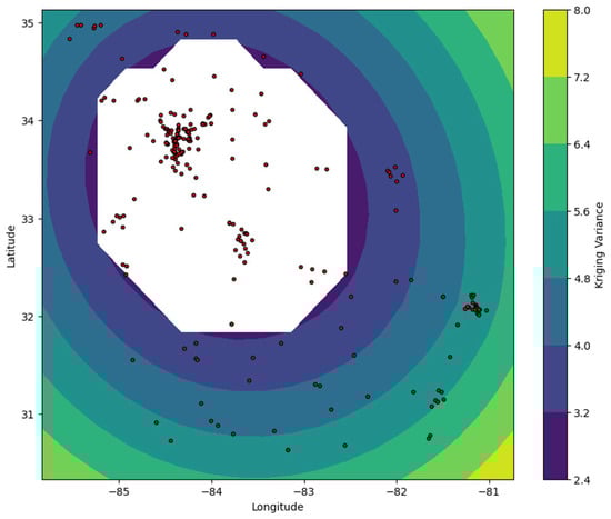 Spatial kriging is a geostatistical technique used to interpolate the value of a random field (such as elevation, rainfall, or chemical concentrations) at specific locations based on observations from nearby points []. This method accounts the for statistical relationship between measured points and provides the Best Linear Unbiased Estimator (BLUE) []. Given the scale of the network, we first narrowed the search space. In this study, we applied ordinary kriging [], using latitude and longitude as coordinates for existing sensors (i.e., CCSs) across the network, with Annual Average Daily Traffic (AADT) as the measurement variable. The kriging variance of AADT is shown in Figure 6. The results indicate lower variance in the Atlanta metropolitan area, attributed to the higher density of existing sensors, whereas rural regions of Georgia display higher variance due to sparser sensor coverage.