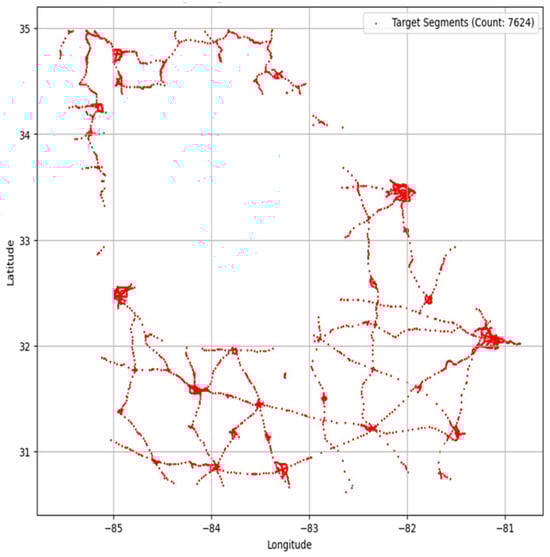 It is worth noting that while TSLP could be formulated for different objectives, such as travel times estimation [,] or speed monitoring [], the most common and important goal of the TSLP is to enhance the observability of traffic flows at the network level [], which can be categorized in different ways, such as the flow information on specific link/path segments [] or the O/D trips []. In this paper, we focused on the segment-level flow estimation across the entire state of Georgia, which belongs to the flow observability defined in [].