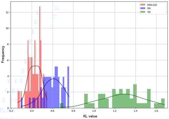 Histogram of KL values for KNN-IGD, GA, and RS.