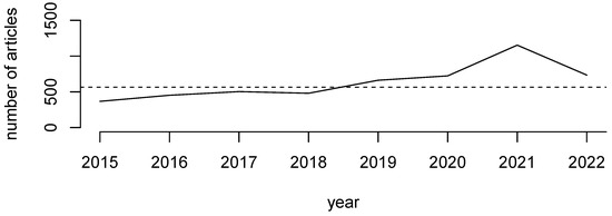 Number of articles in the selection plotted against their publication date (with 2023 omitted). The dashed line represents the mean value.