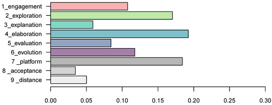 Figure 2 shows the expected topic proportions per paper. The largest proportions among the keyword-assisted topics were found in elaboration and exploration, followed by evolution and engagement. The explanation topic had the smallest expected proportion among the keyword-assisted topics. Among the keywordless topics, the first topic, referring to learning platforms, dominated. Overall, the topic proportions were balanced, indicating that most articles covered multiple topics with a high probability.