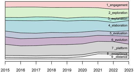 Figure 3 illustrates the dynamics of topic proportions over the publication years. Notably, we observed a slight increase in the literature focused on engagement in 2018 and 2022, as well as a significant rise in works addressing challenges in distance education during the pandemic restrictions of 2020–2021. Furthermore, in 2023, there was a notable increase in the literature devoted to the elaboration and evolution stages of the learning cycle, highlighting their growing importance in online learning applications.