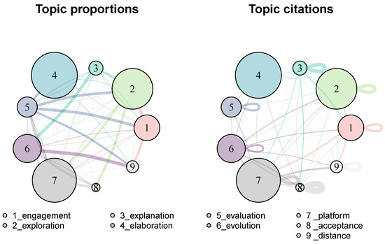 In the left panel of Figure 4, we observe that articles with a high proportion of the engagement topic often also cover a significant proportion of exploration issues, and this topic is also associated with challenges in distance education. Similarly, articles with a high proportion of exploration tend to address themes related to learning platforms and technology acceptance issues. The explanation topic is linked to exploration and evolution, while articles focusing on evolution are heavily related to challenges in distance education. The evaluation topic exhibits strong interrelations, particularly with engagement, exploration, elaboration, the learning platforms topic, and challenges in distance education. Additionally, learning technology acceptance is closely tied to the evolution of learning systems and platform design.