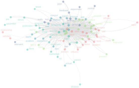 Additionally, we plot the network of the top 20 words for each topic based on the co-occurrences of the respective words in the documents. The resulting network is presented in Figure 5. The network graph shows that top words from the same topic tend to be interconnected but also relate to top words from other topics. Specifically, the top words of the evaluation topic (dark blue) are interconnected with those from the elaboration (light blue) and explanation (turquoise) topics. A noticeable interrelation is also seen between the top words of the engagement topic (red) and those of the elaboration stage (light green).