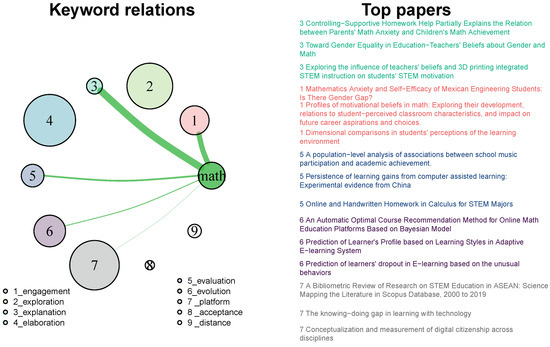 (Left plot) Connections (lines) between the keyword (math) and the topics, with line width indicating frequency. (Right plot) Titles of the top three papers referring to learning cycle topics 1–5 that contain the keyword.