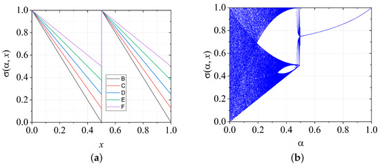 Equation (3) represents the modified Bernoulli chaotic map (MBCM), where denotes the iteration step, specifies the initial condition of the MBCM, and is the output of MBCM at iteration n. The limits in Equation (3) are , , and , with the control parameter . The MBCM, denoted as , exhibits odd symmetry and chaotic behavior when . This map is defined by and can be visualized in Figure 1a for different values of , while its bifurcation diagram is shown in Figure 1b. Note that the chaotic region does not cover the whole phase space.