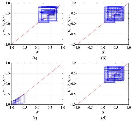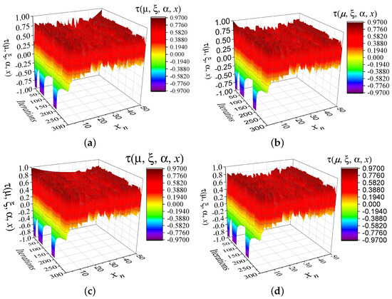Similarly, these results can be validated by generating a trajectory diagram of the SM-MBCM for different values of A over 300 iterations. Figure 5a depicts the trajectory diagram for with . Figure 5b demonstrates consistent results for with . Figure 5c demonstrates comparable behavior to the previous cases but for and . Figure 5d illustrates the trajectory for and .